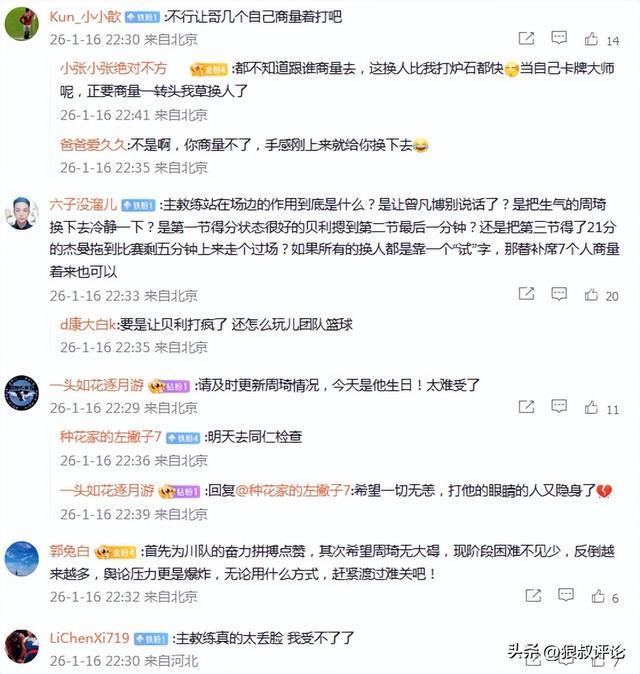 有球迷点评说道:主教练站在场边的作用到底是什么?是让曾凡博别说话了?是把生气的周琦换下去冷静一下?是第一节得分状态很好的贝利摁到第二节最后一分钟?还是把第三节得了21分的杰曼拖到比赛剩五分钟上来走个过场?如果所有的换人都是靠一个“试”字,那替补席7个人商量着来也可以。